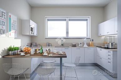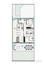 La seconda tipologia di villa su piano unico è composta da ampia zona giorno luminosa con sala da pranzo e cucina a vista, accesso diretto al portico vivibile ideale per pranzi e cene all'aperto, tramite disimpegno si accedde alla zona notte composta da camera matrimoniale, camera singola, lavanderia e bagno finestrato. A completare la soluzione posto auto doppio al piano terra. Giardino privato per momenti di relax.