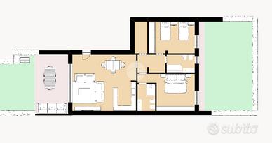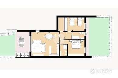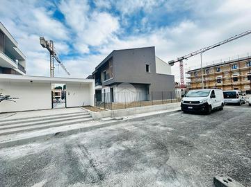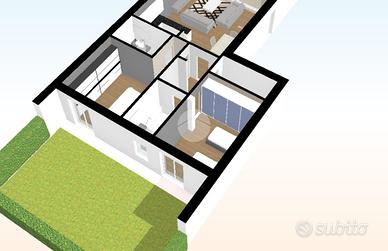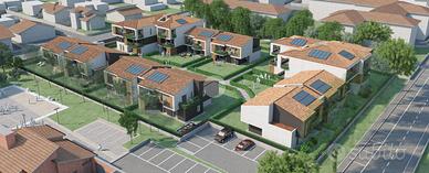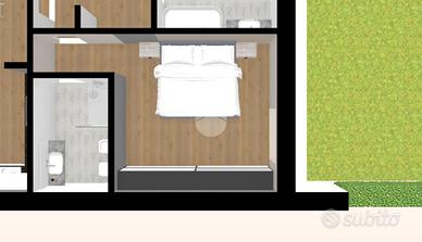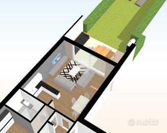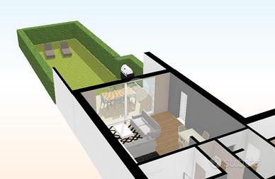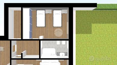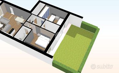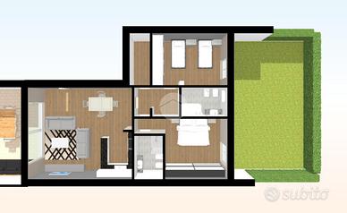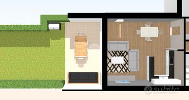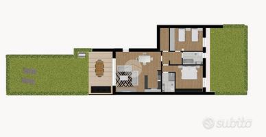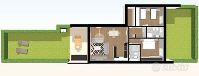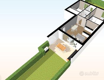 Ampio trilocale al piano terra, con giardino privato fronte - retro di 130 mq ca., con portico pranzabile. La spaziosa zona giorno ospita la cucina a vista e dispone di accesso diretto al giardino. Un disimpegno introduce ad un comodo vano ripostiglio, alla camera matrimoniale con bagno padronale e alla camera doppia, servita da un altro bagno finestrato. Dalla zona notte si accede ad un'ulteriore porzione di giardino. Completano doppio box e cantina.