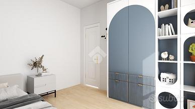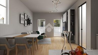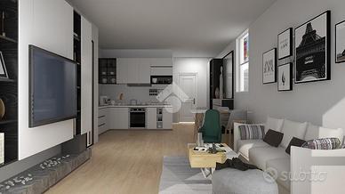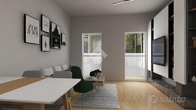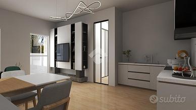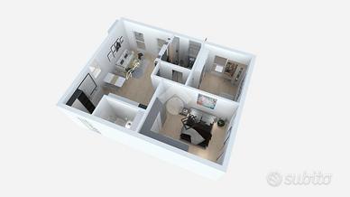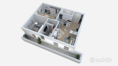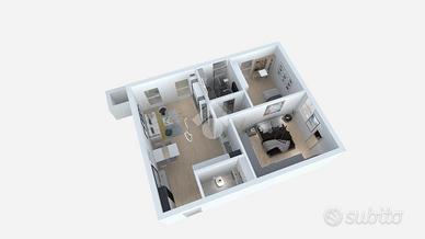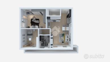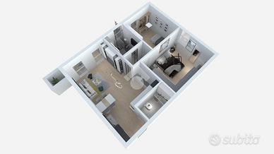 L'abitazione è composta da un ampio soggiorno con cucina a vista, una lavanderia dotata di servizio cieco, un bagno padronale finestrato con doccia, due camere da letto e un affaccio esterno che la zona giorno con la zona notte.