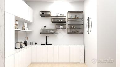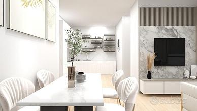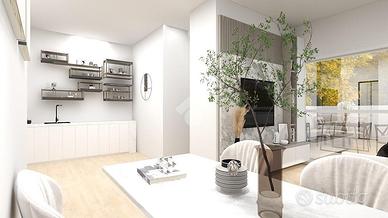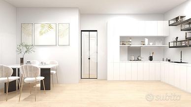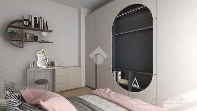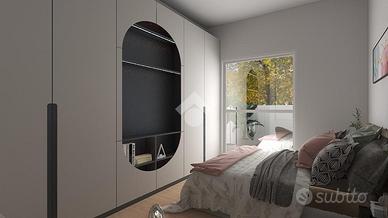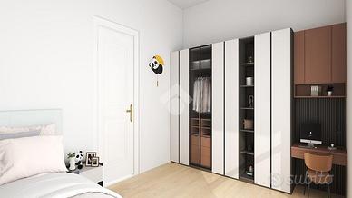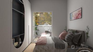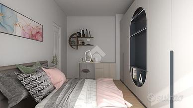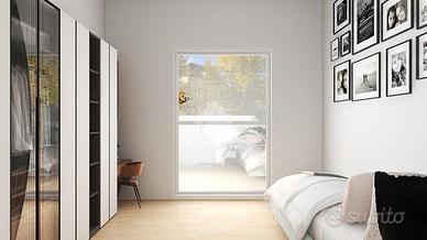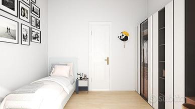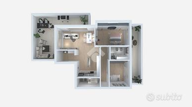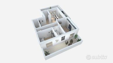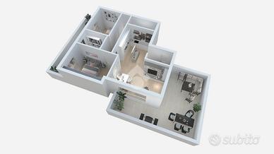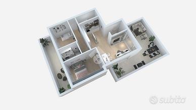 La proposta del trilocale prevede una zona giorno open space ampia e luminosa, due camere da letto (una matrimoniale e una singola), singolo o con doppi servizi (entrambi con doccia uno finestrato, l'altro cieco).