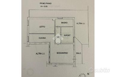 Abitazione al primo ed ultimo piano con ingresso su salotto, cucinotto finestrato, camera matrimoniale, cameretta e bagno.