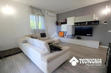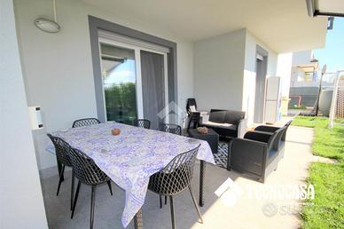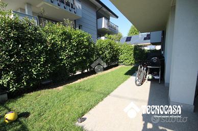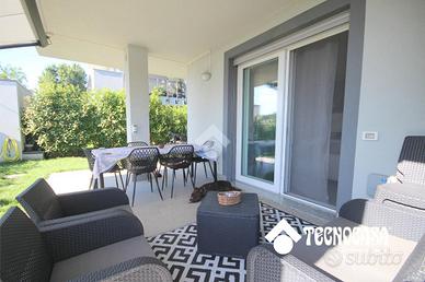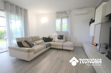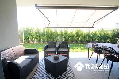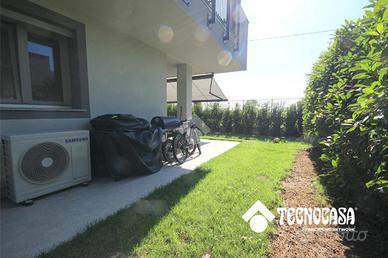 SPLENDIDO APPARTAMENTO CON GIARDINO PRIVATO In una piccola palazzina edificata nel 2022, immersa in una zona residenziale tranquilla ma al tempo stesso comoda per raggiungere le principali vie di collegamento con i paesi limitrofi, proponiamo un appartamento posto al piano terra, caratterizzato da uno splendido giardino privato che lo circonda su tre lati. Una soluzione ideale per chi desidera vivere con il comfort di spazi moderni e il privilegio di un ampio spazio esterno da godere in ogni stagione. L'abitazione si apre su un luminoso soggiorno con accesso diretto al giardino, affiancato da una cucina abitabile che rende la zona giorno pratica e accogliente. La zona notte ospita due camere da letto e due bagni, uno dotato di doccia e l'altro di vasca, pensati per garantire funzionalità e comodità nella vita quotidiana. Le finiture sono curate nei minimi dettagli: pavimenti in gres porcellanato, porte extracapitolato, infissi con maniglia antirapina, tapparelle elettriche con ganci di sicurezza e porta blindata. L'appartamento è inoltre dotato di impianto di ventilazione meccanica controllata, aria condizionata sia nella zona giorno che nella zona notte e riscaldamento a pavimento, per il massimo comfort in ogni periodo dell'anno. A completare la proprietà troviamo un ampio box doppio di 33mq e la cantina, spazi accessori che contribuiscono a rendere questa soluzione ancora più completa e funzionale. Le spese condominiali ammontano circa a euro 160€/mese più quota consumi riscaldamento, acqua calda e fredda Un appartamento moderno e raffinato, perfetto per chi cerca tranquillità, sicurezza e qualità senza rinunciare alla vicinanza ai principali servizi e collegamenti.