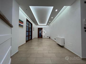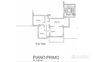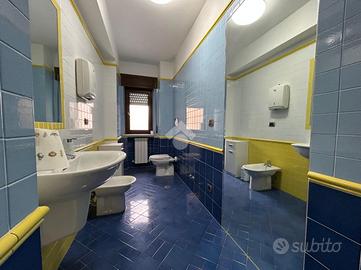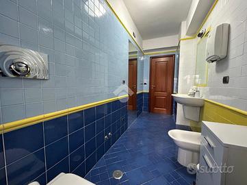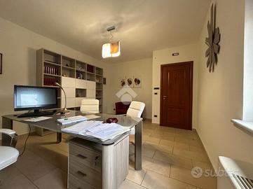 L'appartamento posto al primo piano ha una metratura di circa 106 mq ed è composto da ampio ingresso con controsoffittatura e faretti led che è possibile utilizzare come reception o come sala d'attesa, un'altra camera ampia separata dalla prima tramite una doppia porta scorrevole in legno e vetro che ha uscita su un terrazzo esposto ad ovest. Sono presenti ancora due camere studio e un'altra piccola camera utilizzabile come archivio o ripostiglio.