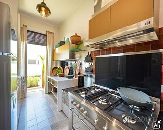 L'appartamento, di circa 100 mq, offre spazi ben distribuiti e funzionali. Attraverso il disimpegno troviamo una comoda cucina con accesso su un balcone funzionale.