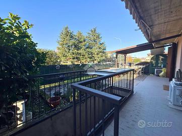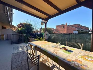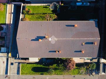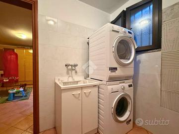 All'esterno, un'area piastrellata esclusiva accoglie l'abitazione e offre uno spazio perfetto per momenti di relax e convivialità. Da qui una scala conduce al piano seminterrato, dove si sviluppa una taverna di circa 40 mq, completa di ripostiglio e funzionale lavanderia, con accesso diretto al box doppio in lunghezza.