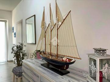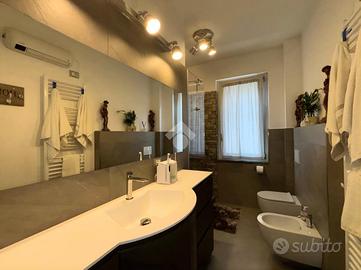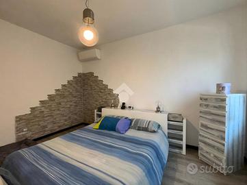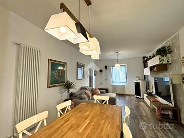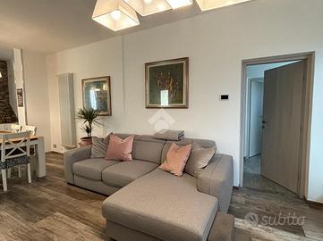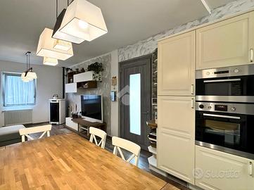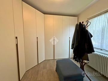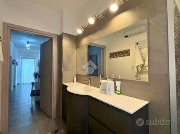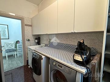 La zona giorno si sviluppa in un luminoso open space con cucina a vista, mentre la zona notte comprende due camere, di cui una attualmente adibita a cabina armadio. Il bagno finestrato è dotato di un ampio box doccia. Completa il piano una lavanderia e un disimpegno dal quale si accede comodamente al balcone.