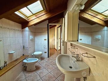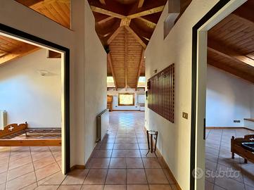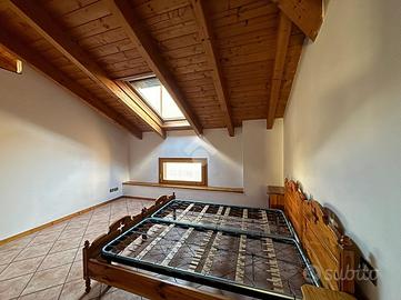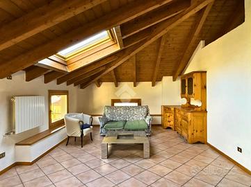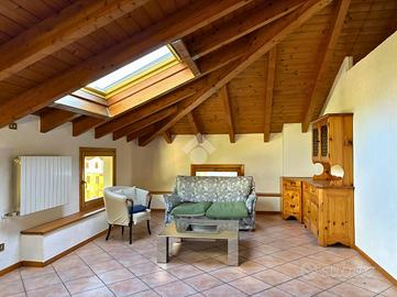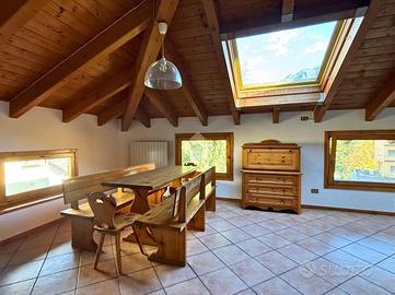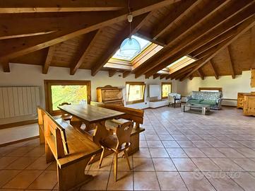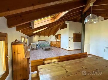 L'appartamento si apre su un ampio open space con zona giorno accogliente, caratterizzato da splendide travi in legno a vista e numerose finestre e abbaini che donano luce naturale e calore all'ambiente.