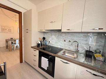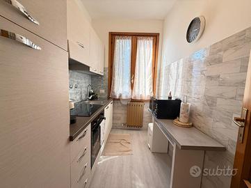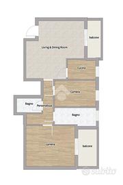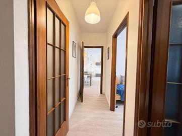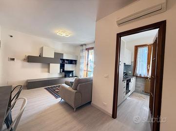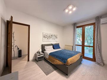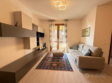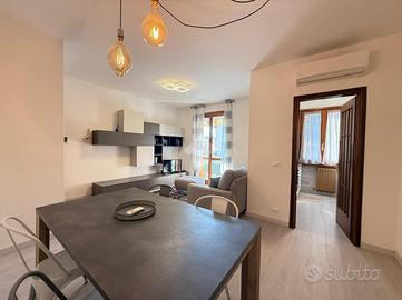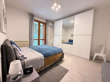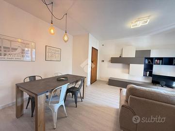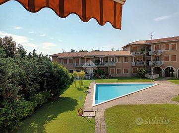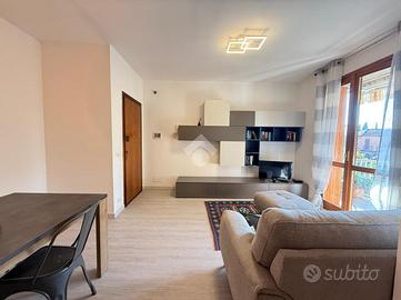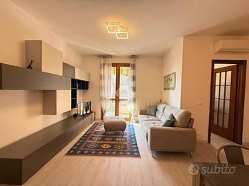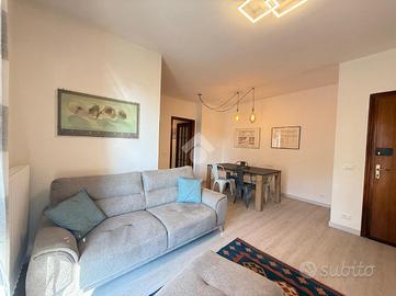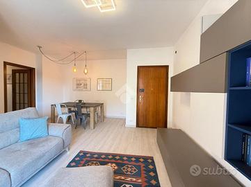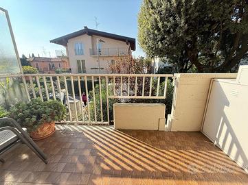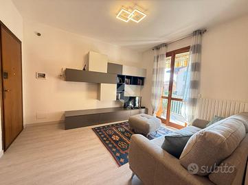 Ubicato in quartiere molto richiesto, in contesto esclusivo dotato di piscina e parco condominiale, situato a pochi passi dalle principali piazze, comodo a tutti i servizi, negozi e al lago, appartamento trilocale con doppi servizi al piano primo. L' ingresso apre direttamente sulla zona giorno con affaccio sul primo balcone e da cui si accede alla cucina separata. La zona notte è composta da due camere di cui una matrimoniale con balcone privato e dai due bagni. Completano la proprietà la cantina e l'autorimessa al piano seminterrato. L' appartamento viene venduto completo di arredo moderno.