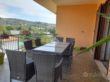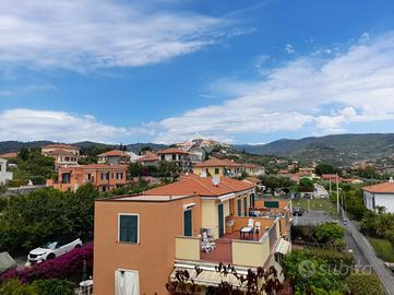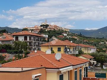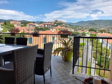 L' appartamento si trova al secondo piano con ascensore, composto da soggiorno doppio con angolo cottura, due camere matrimoniali, bagno con finestra, due terrazzi vivibili con vista panoramica verso Diano Castello e verso il mare.