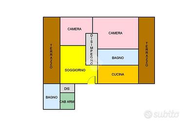 L'appartamento è composto da tre locali ben distribuiti, con una zona giorno luminosa che si apre su due terrazzi, perfetti per momenti di relax all'aperto.