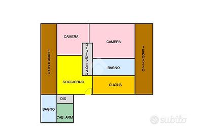 L'appartamento è composto da tre locali ben distribuiti, con una zona giorno luminosa che si apre su due terrazzi, perfetti per momenti di relax all'aperto.