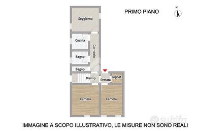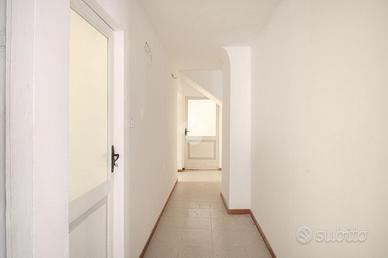 Entrambi conducono a un corridoio centrale che disimpegna gli ambienti della casa: la zona giorno, attualmente composta da soggiorno e cucina abitabile, e le due ampie camere da letto matrimoniali. Completano la proprietà due bagni, uno principale finestrato e dotato di vasca, e uno di servizio, oltre a un pratico ripostiglio.
