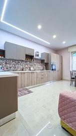 La zona giorno accoglie con un soggiorno con angolo cottura, valorizzato da luci a soffitto che creano un ambiente piacevole e curato, ideale per vivere la quotidianità con ordine.