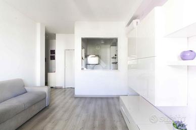 L'abitazione è composta da un ampio soggiorno con cucina a vista, entrambi con uscita diretta sul terrazzo perimetrale, ideale per momenti di relax all'aperto.
