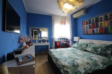 A destra del bagno troviamo la camera matrimonaile con un letto king size con testiera imbottita e comodini minimal. La stanza è valorizzata da tende leggere e da un piccolo angolo beauty corner con poltroncina e specchio.