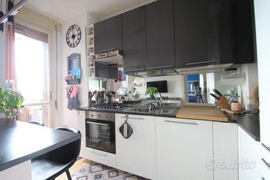 All'ingresso sulla nostra destra troviamo la cucina completamente attrezzata e dotata di un bancone centrale che funge sia da piano di lavoro che da comoda zona snack o da colazione. Il bancone è accompagnato da sgabelli alti perfetti per una pausa caffè o un pranzo veloce.