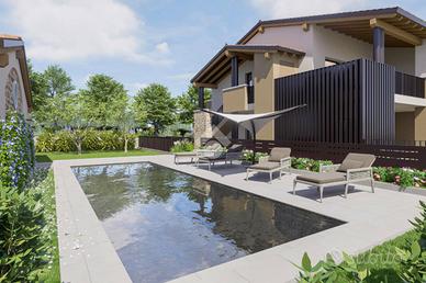 Un contesto di lusso con piscina, composto da 4 appartamenti trilocali e una villa singola con ampi sfoghi esterni.