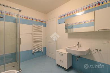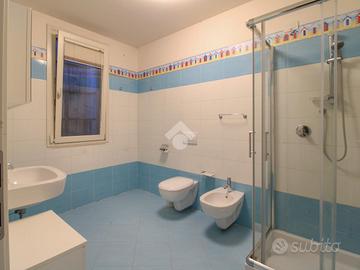 Dal soggiorno, infatti, con pochi gradini in marmo, un disimpegno ci collega alla lavanderia dotata di allacci per lavatrice ed asciugatrice a colonna e lavello ed al bagno del piano, finestrato, con sanitari in ceramica e doccia.