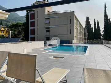 A completare la soluzione sono presenti una piscina sul tetto dello stabile con vista lago, una cantina ed un posto auto nel garage.