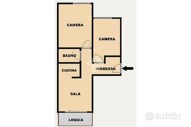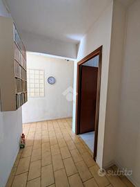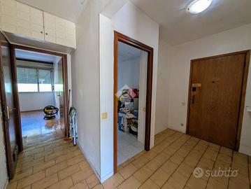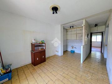 Ci accoglie l'ingresso che ci conduce alla zona giorno che è composta dall'angolo cottura e dalla sala da pranzo che è dotata di porta finestra con sfogo nella loggia.