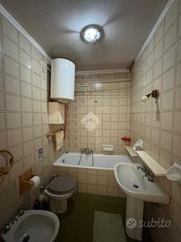 Il bagno è piastrellato sui toni chiari e dotato di vasca.