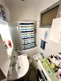 Il bagno è piastrellato sui toni chiari, dotato di vasca e finestra.
