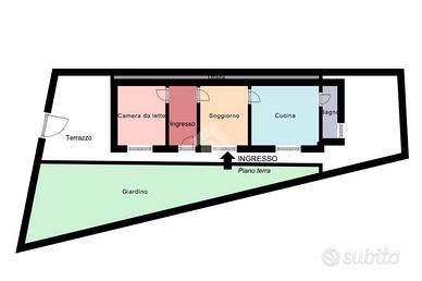 L'immobile è composta da: un comodo ingresso che collega la camera matrimoniale e una camera che si potrebbe adibire o come sala da pranzo o come seconda camera da letto, una cucina luminosa con accesso allo spazio esterno e il bagno finestrato con vasca.