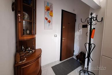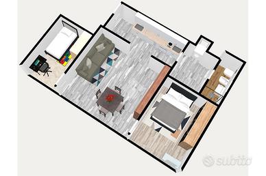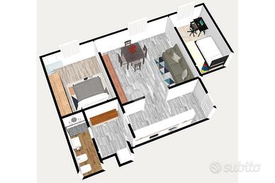 L'ingresso si apre su un angolo cottura funzionale, che si integra armoniosamente con il soggiorno.