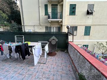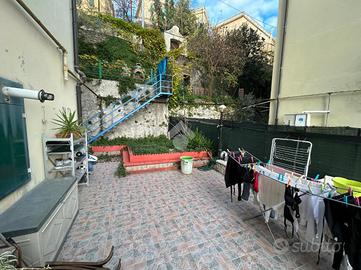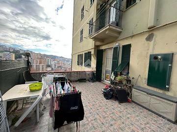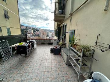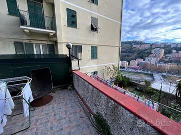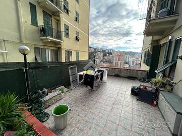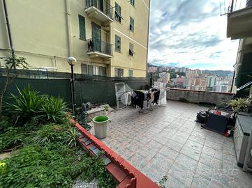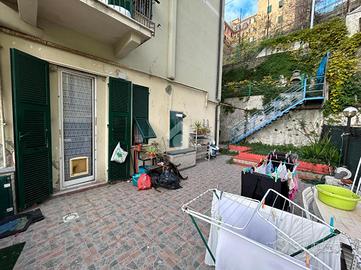 La casa si sviluppa su una metratura ben distribuita e accoglie gli ospiti con un ingresso che conduce direttamente alla zona giorno, un ambiente armonioso in cui la cucina e il salottino sono disposti in maniera funzionale, creando un'atmosfera intima e ben organizzata. Da qui si accede all'ampio terrazzo, uno spazio esterno davvero prezioso che regala una vista aperta su Marassi e che si distingue per le sue molteplici possibilità di utilizzo: una parte è dedicata a un piacevole angolo di giardino, mentre la zona superiore, circondata dal verde, ospita un barbecue perfetto per cene all'aperto e momenti di relax.