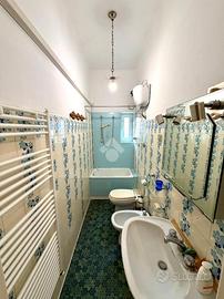 Il bagno è piastrellato sui toni chiari, dotato di vasca e finestra.