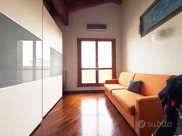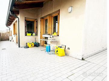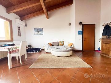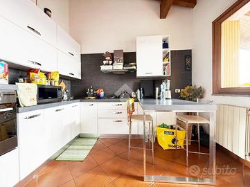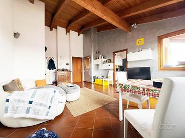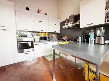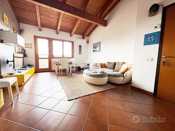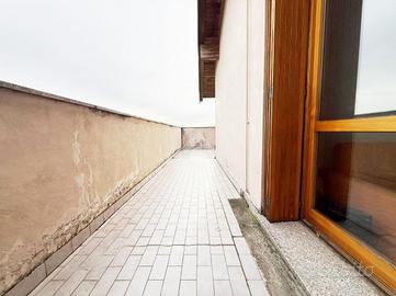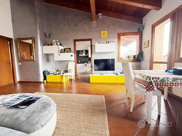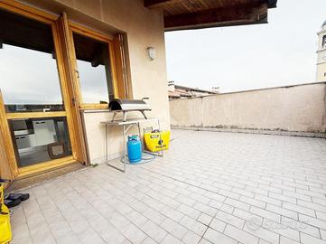 Caratterisistico trilocale circondato da ampio terrazzo. L'abitazione proposta sorge all'ultimo piano di un ordinato contesto condominiale dotato di ascensore ed ubicato in pieno centro paese, in prossimità di tutti i principali servizi. Internamente ritrutturato, presenta un'accogliente zona giorno di generosa metratura con accesso al riservato terrazzo oltre comoda cucina abitabile; la zona notte ospita due camere da letto e doppi servizi. L'ampia metratura dell'immobile ha reso possibile la creazioni di spazi funzionali e ben distribuiti. Annessi box autorimessa e cantina.