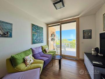 All'interno, l'appartamento si apre su un ampio soggiorno con angolo cottura, caratterizzato da un affaccio ad est che permette di godere della luce naturale del mattino. Dal soggiorno si accede direttamente a un terrazzo abitabile con vista mare frontale, perfetto per cene estive all'aperto o per rilassarsi ammirando il panorama mozzafiato.