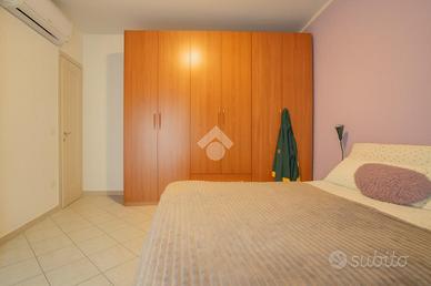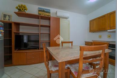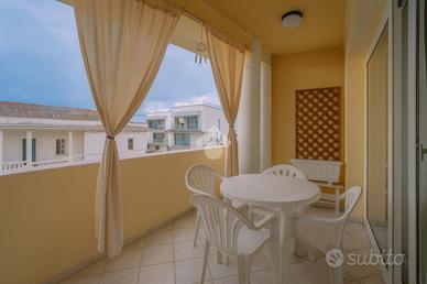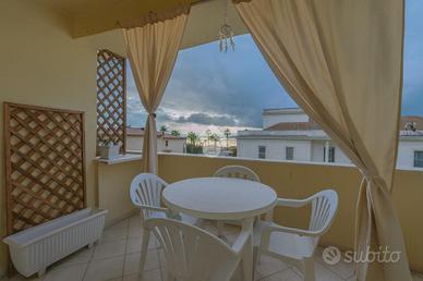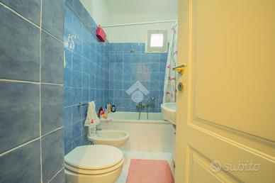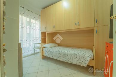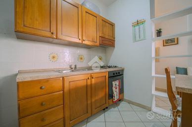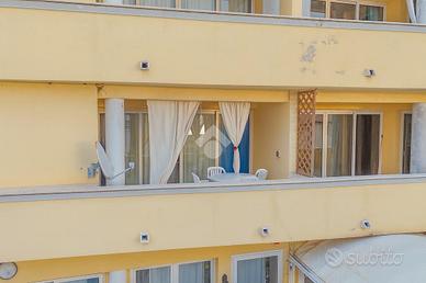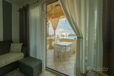 Questo primo piano sviluppato su unico livello possiede la metratura tipica della casa da mare, con un ingresso che accoglie su una luminosa sala con angolo cottura a vista e terrazzo con vista suggestiva sul mare dove è possibile mangiare in assoluta riservatezza con amici e parenti. Dal disimpegno si accede alla zona notte dove sono presenti 2 stanze da letto di cui una matrimoniale con balcone che prospetta sul lato opposto all'ingresso e seconda camera anch'essa dotata di balconcino. Completa l'interno un bagno finestrato con vasca. Importante inoltre la presenza di una cantina compresa assieme all'appartamento posta al piano seminterrato e accessibile direttamente dall'interno tramite scala o ascensore.