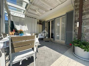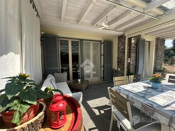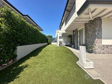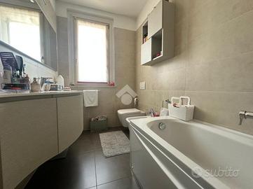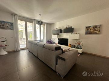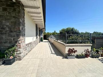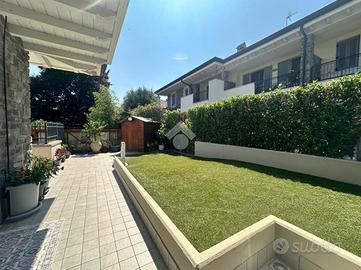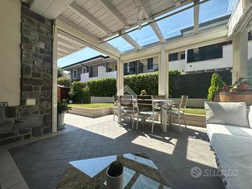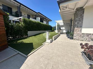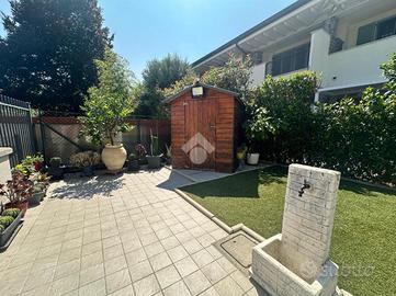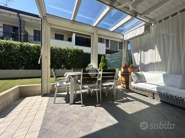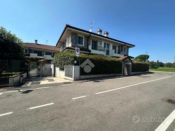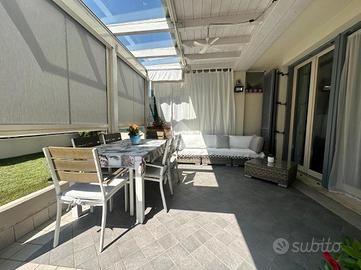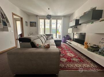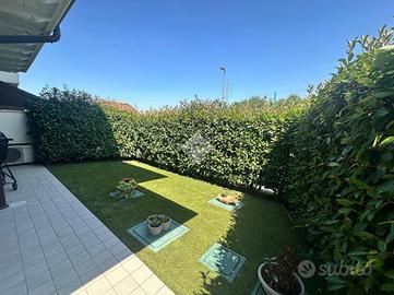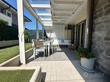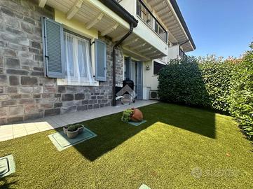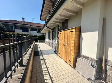 GREZZAGO zona residenziale - In un mini contesto di pregio composto da costruzioni recenti, con travi in legno e pietre a vista, ampie aree verdi e di svago, in una zona tranquilla e riservata, vicino ai servizi di prima necessità offerti dal paese. Connesso a Milano grazie all'Autostrada A4 di Trezzo sull'Adda ed alla Metropolitana MM2 Gessate. Al piano terra di un condominio di sole 4 unità abitative costruito nel 2012, l'Agenzia Immobiliare Tecnocasa propone trilocale in classe B con riscaldamento a pavimento e pannelli solari, doppi servizi, veranda ed ampio giardino su tre lati con erba sintetica. L'appartamento si sviluppa a partire dall'ingresso nel luminoso soggiorno, grazie alla luce naturale della doppia vetrata, oltre cucina abitabile, entrambi locali con accesso alla veranda chiusa ed al giardino. Il disimpegno conduce alla zona notte composta da cameretta, due bagni finestrati, uno con vasca ed uno con doccia, e camera matrimoniale, con secondo accesso al giardino laterale. La soluzione vanta di rifiniture quali serramenti in legno con doppi vetri, pavimenti in gres porcellanato effetto legno e rivestimento esterno in pietra con travi a vista. Dispone di impianto di climatizzazione e di ventilazione meccanica controllata dall'aria, oltre impianto di allarme. Completano la proprietà una cantina e due box singoli. --------------------------------------- La presente descrizione e le immagini riportate hanno valore puramente indicativo e non costituiscono elemento contrattuale.