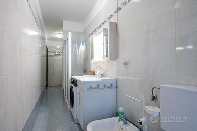 Il bagno, particolarmente spazioso e profondo, è finestrato e completo di box doccia.