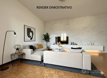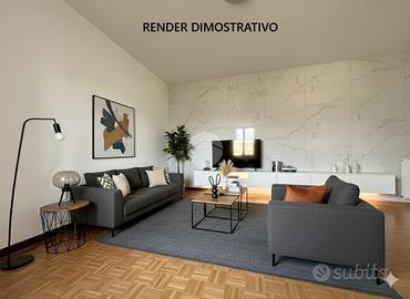 All'ingresso troviamo la zona giorno molto spaziosa con la cucina a vista (possibilità di ricreare la cucina abitabile o completamente open space) ed il soggiorno con accesso diretto alla terrazza coperta, molto ampia, in grado di ospitare un tavolo con sedie o anche un divanetto da esterno.