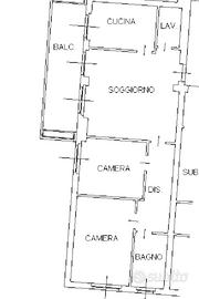 L'immobile è così meglio disposto: ingresso sull'ampio soggiorno, cucina separata abitabile con balcone, lungo corridoio, due camere da letto, bagno con vasca e lavanderia cieca.