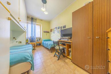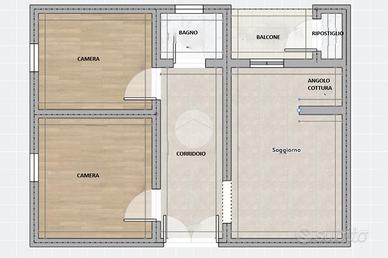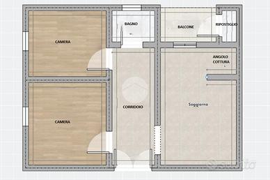 La soluzione ci accoglie con un ampio corridoio che divide perfettamente la zona giorno composta da salone con angolo cottura con accesso diretto ad un balcone, dalla zona notte composta da camera matrimoniale, un'ampia cameretta e un bagno finestrato.