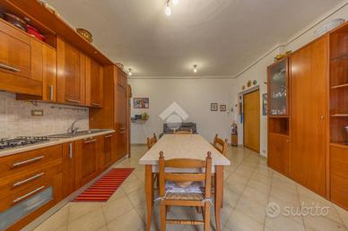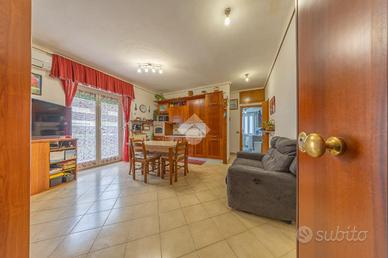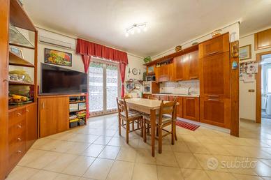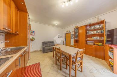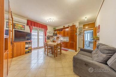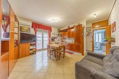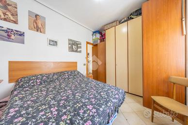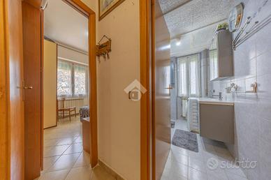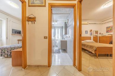 Entrando, ci accoglie il soggiorno con l'angolo cottura, con da un lato, la porta finestra che da sul balcone e dall'altro, un disimpegno dal quale si snodano gli altri ambienti, ovvero due camere da letto ed un bagno dotato di finestra.