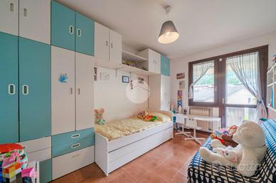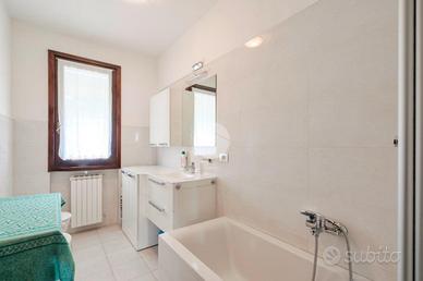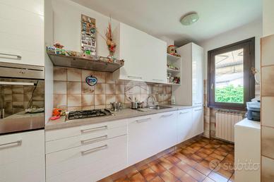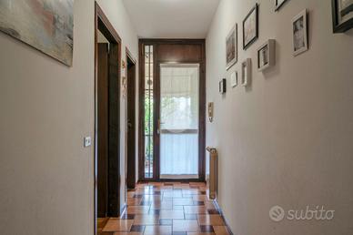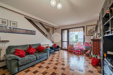 La soluzione è di testa con tre lati liberi e con ingresso indipendente. Dispone di ampia zona pranzo con camino, cucina in ambiente separato, un bagno finestrato ed un balcone al piano terra.