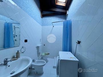 L'ingresso si apre direttamente su un accogliente soggiorno con angolo cottura, uno spazio luminoso e ben distribuito, ideale per la vita quotidiana e i momenti di convivialità. Le travi a vista e le altezze tipiche della mansarda conferiscono all'ambiente un'atmosfera calda e suggestiva.
