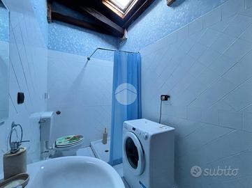 L'ingresso si apre direttamente su un accogliente soggiorno con angolo cottura, uno spazio luminoso e ben distribuito, ideale per la vita quotidiana e i momenti di convivialità. Le travi a vista e le altezze tipiche della mansarda conferiscono all'ambiente un'atmosfera calda e suggestiva.