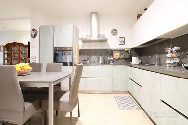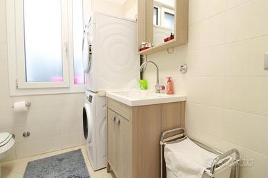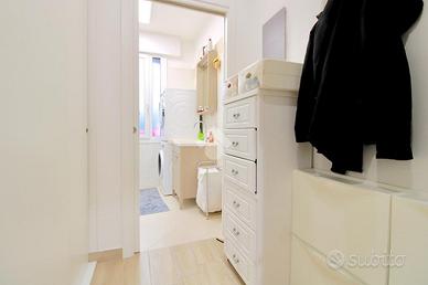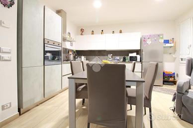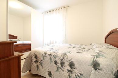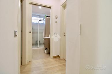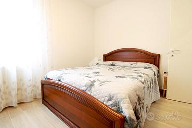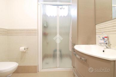 L'interno si apre su una spaziosa zona giorno, composta da un soggiorno accogliente e una cucina moderna, finemente arredata e dotata di tavolo da pranzo. Proseguendo, il disimpegno conduce alla zona notte, dove si trovano una camera matrimoniale e una seconda camera con letto matrimoniale e un letto singolo. L'appartamento dispone inoltre di due bagni finestrati, entrambi dotati di doccia.