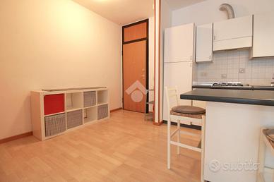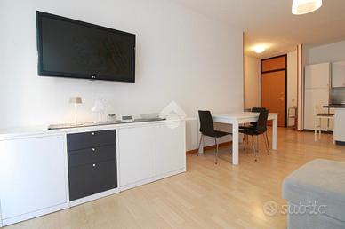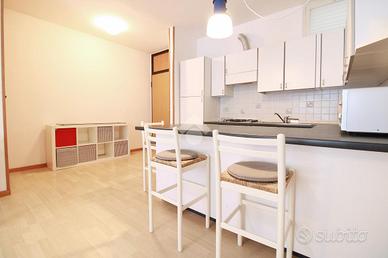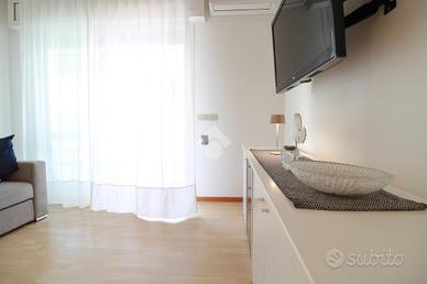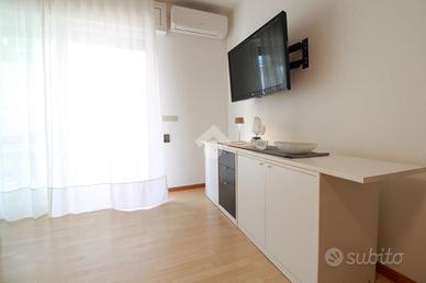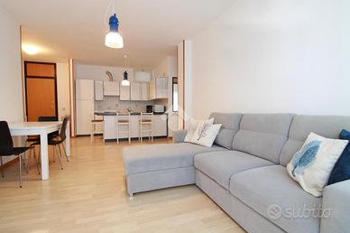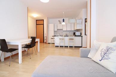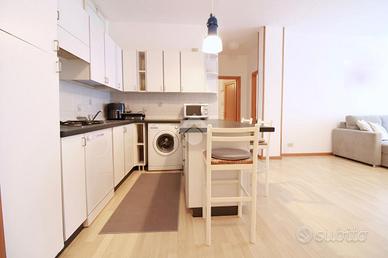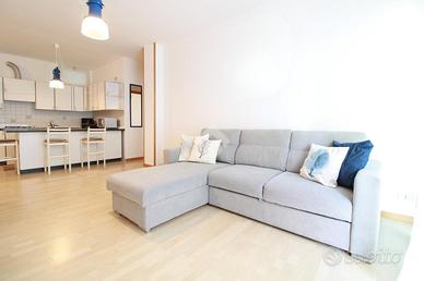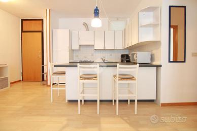 L'ingresso conduce alla zona giorno, composta da angolo cottura, soggiorno con divano, tavolo da pranzo e accesso diretto alla terrazza.