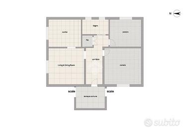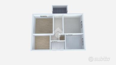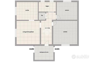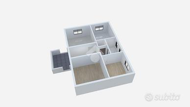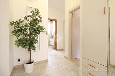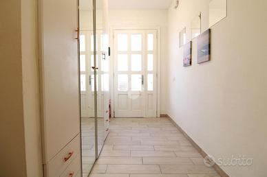 Tramite la scala esterna si accede ad un piccolo terrazzo comune, dove si trova l'ingresso dell'appartamento. L'ingresso distribuisce gli spazi: sulla sinistra troviamo la zona living, composta da soggiorno e cucina abitabile separata; proseguendo, due camere matrimoniali, entrambe esposte a sud e ben illuminate. Un pratico ripostiglio può fungere anche da cabina armadio e può ospitare anche la lavatrice. Infine, il bagno, finestrato e finemente arredato, è dotato di doccia.