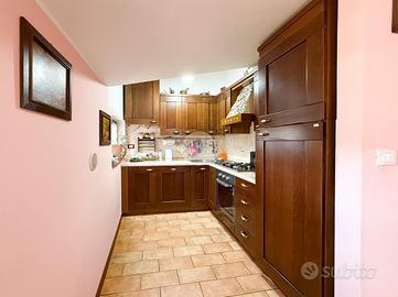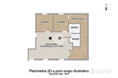 L'ingresso si apre sul soggiorno con angolo cottura, dal quale si accede al disimpegno che conduce alla zona notte composta da due camere da letto: una matrimoniale ed una singola. I doppi servizi, entrambi finestrati, presentano rispettivamente box doccia e vasca, garantendo praticità e comfort. È inoltre presente un ripostiglio, utile per ottimizzare gli spazi.