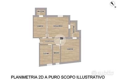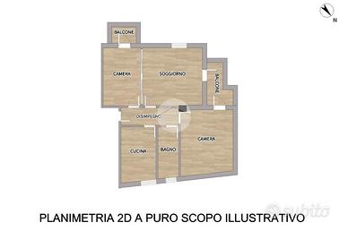 L'immobile è composto da ingresso su disimpegno, cucina abitabile, ampio soggiorno con balcone, camera matrimoniale con accesso allo stesso balcone del soggiorno, camera singola con accesso a secondo balcone e bagno finestrato con piatto doccia.