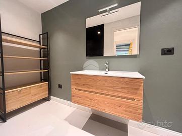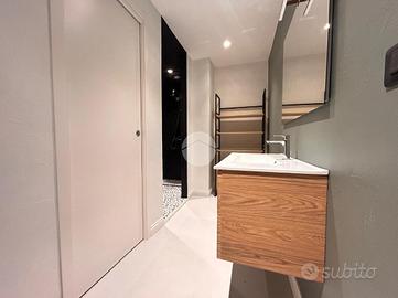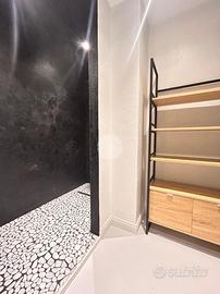 Il bagno è stato curato nei dettagli, con un box doccia e rivestimenti in microcemento che ne esaltano la modernità.