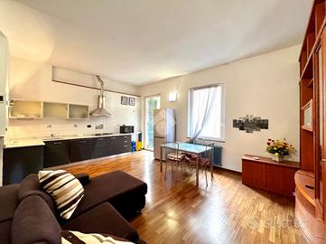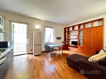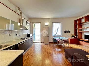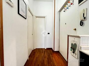 L'ingresso è su piccolo disimpegno aperto sulla zona giorno open space. Qui la cucina e il soggiorno si fondono in un'unica stanza, calda e intima, dove finestra e portafinestra con balcone rendono l'ambiente ricco di luce naturale, oltre a garantire la possibilità di suddivisione tra i due spazi, per chi lo preferisse.