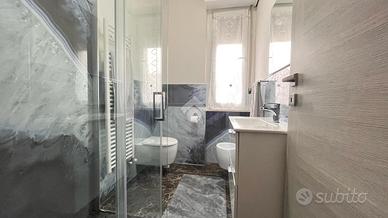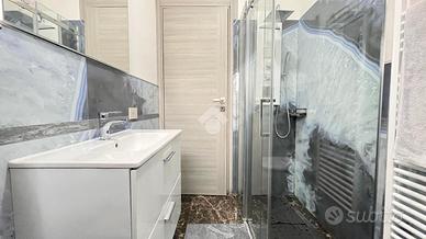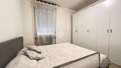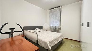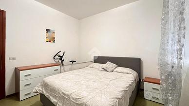 Una porta separa la zona notte, composta da una camera matrimoniale di ampie dimensioni, una camera singola e un bagno con doccia ristrutturato di recente. L'immobile dispone di riscaldamento autonomo e di un climatizzatore di recente installazione.